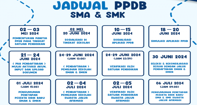 JADWAL PELAKSANAAN: Sosialisasi SPMB : 15 April s.d 20 Juni 2025 Pra Pendaftaran (Aktivasi Akun, Input dan Upload dokumen) : 21 s.d 24 Juni 2025 Pendaftaran / Pemilihan S